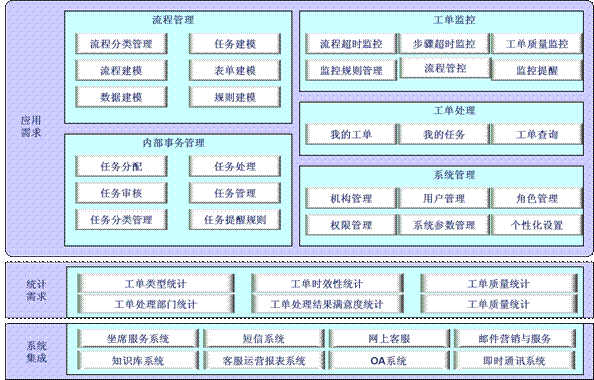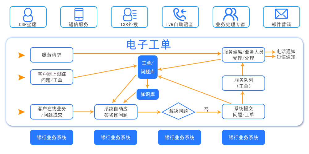 电子工单系统通过与呼叫中心系统、电话营销系统、网上客服、知识库、录音系统、邮件系统等的集成,极大的方便工单的创建及处理。实现客服相关的流程建模、运行的支持,呼叫中心、电话营销、网银、手机银行等可以访问流程支持平台上发布的业务流程。