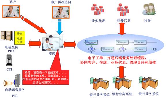 通过建设整合电子工单处理流程,构成银行客服系统的“神经主干道”,把各式各样的应用系统、渠道和资源融合起来,统一外部接口,实现数据互通、操作互通形成统一的运营整体,进而实现内部业务流程和外部业务流程的统一协调,数据处理和业务处理流程的自动化和可定制,以适应灵活多变的业务需求,从而实现银行客服管理水平、运营效率、服务能力等方面的整体提升。